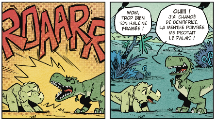 Toute la force de ces gags c’est qu’ils peuvent parfaitement fonctionner si l’on remplace les grosses bestioles disparues par deux humains. Comme si la BD était un miroir qui nous transformait en monstres des temps anciens. Mais ne sommes nous pas déjà les monstres des temps nouveaux ? Qui comme les dinosaures sont appelés à disparaître un jour ou l’autre.